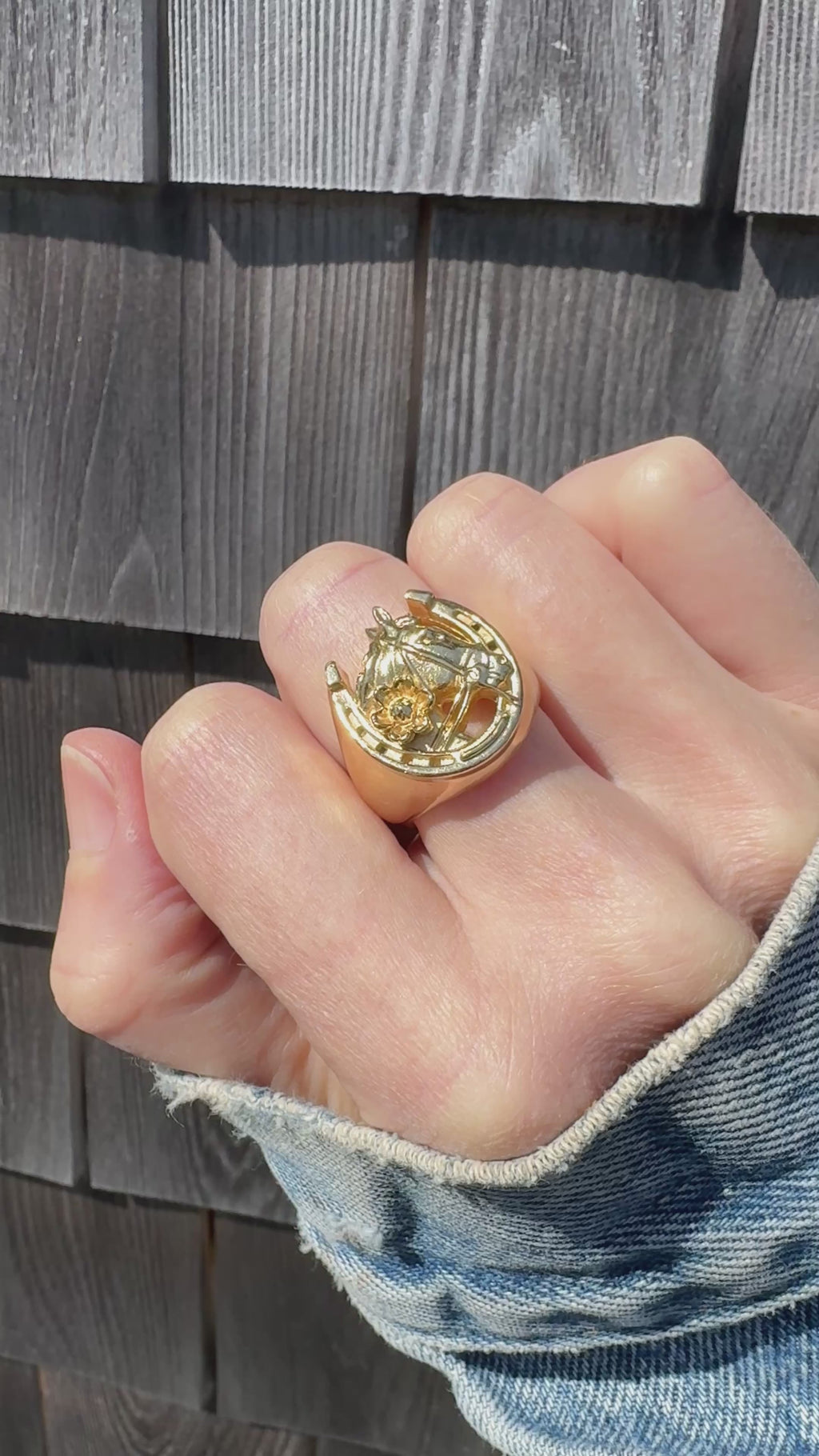 A horse head silhouette is placed inside a horseshoe shaped ring embellished with a daisy flower. In 14k gold plate with a 5 micron coverage to guarantee protection against rubbing off. Each ring is completed with a comfort fit band that hugs your finger in the most perfect manner. These horseshoe / horse head signet rings are available in oxidized brass, bronze, sterling silver. For these ring options please follow the link here: https://ivrybellejewelry.com/products/horse-head-signet-ring